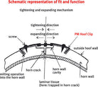 For repairing cracks, the regular PM Hoof Clip has a mechanism that can be tightened or expanded for maximum control of crack stability levels.