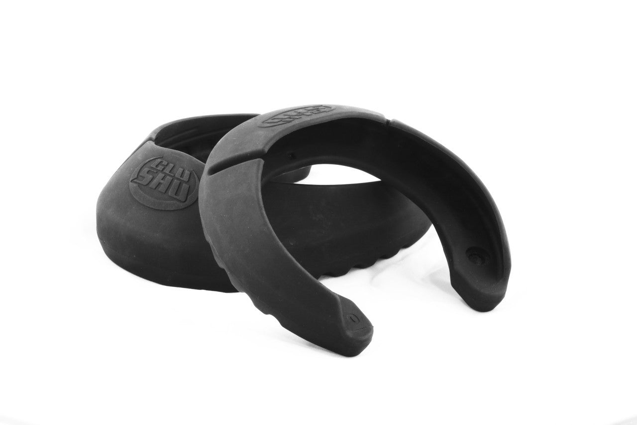 GluShu glue-on horseshoes comprised of an aluminum shoe bonded to a urethane cuff with cushioned inner rim.